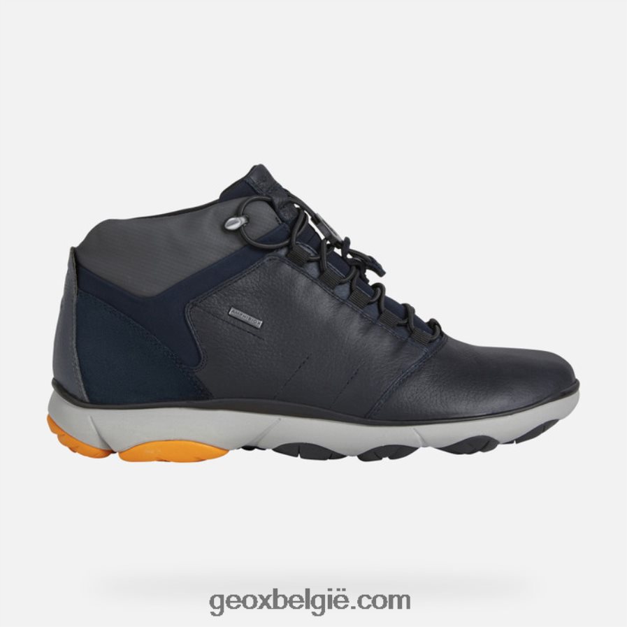 waterdichte enkellaars voor heren met een stedelijke esthetiek en ultralichte, superademende constructie. weergegeven in een marineblauw palet, nevel 4x4 abx biedt uitzonderlijk comfort en eigentijdse stijl. het bovenwerk van getrommeld kerrieleer is verfraaid met details in wandelstijl en rust op een flexibele zool waarmee je moeiteloos in stijl door winterweer komt.ademend vermogenwaterdichtlichtheidkenmerken