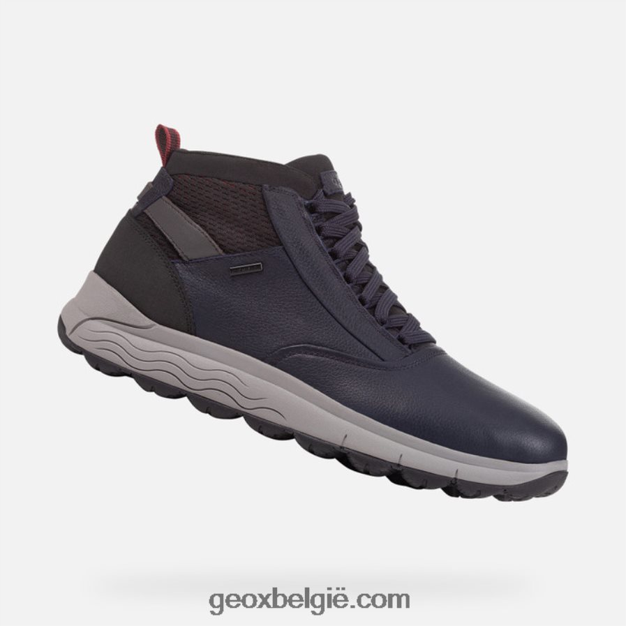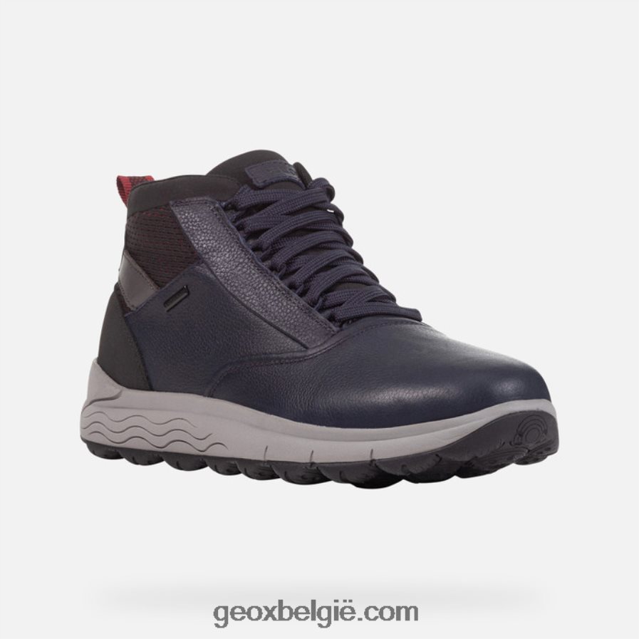 waterdichte heren enkellaars met vetersluiting, urban edge en ongeëvenaard comfort. gemaakt van getrommeld leer en een gebreide stof in een marineblauw palet, sferica 4x4 abx rust op een ultra-hi-tech buitenzool en heeft een trendy eigentijdse esthetiek. ontworpen om een uitstekende grip, uitstekende demping en een ultracomfortabele pasvorm te garanderen, zorgt het voor totaal welzijn bij elke stap, zelfs bij slecht weer.ademend vermogenwaterdichteigenschappen